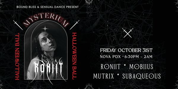 Sensual Dance & Bound Bliss present an evening of music, spectacle, and sensuality at the Mysteriium Halloween Ball on Friday October 31st in Portland. Headlining the event is world-renowned vocalist Roniit accompanied by bondage art by MxBliss. Dress to impress in costume, fetishwear, or other fancy attire. Opening music by dancer-favorite Subaqueous, and exquisite exotic performance art on stage late into the night.