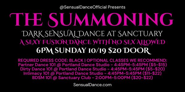 The Summoning at Sanctuary is a dark sensual dance journey! Pre-party classes at Portland Dance Studio start at 4:45PM at The Oak Street Building at 232 SE Oak St, Portland, OR 97214. Then pay at the door for The Summoning starting at 6:00PM at Sanctuary!